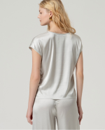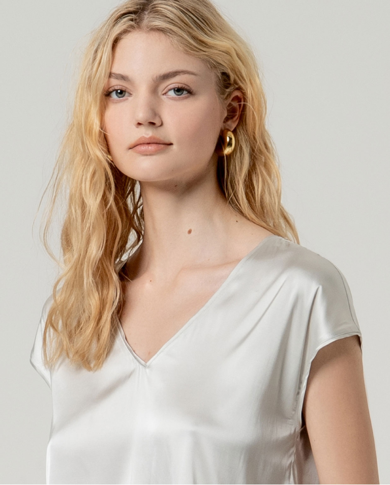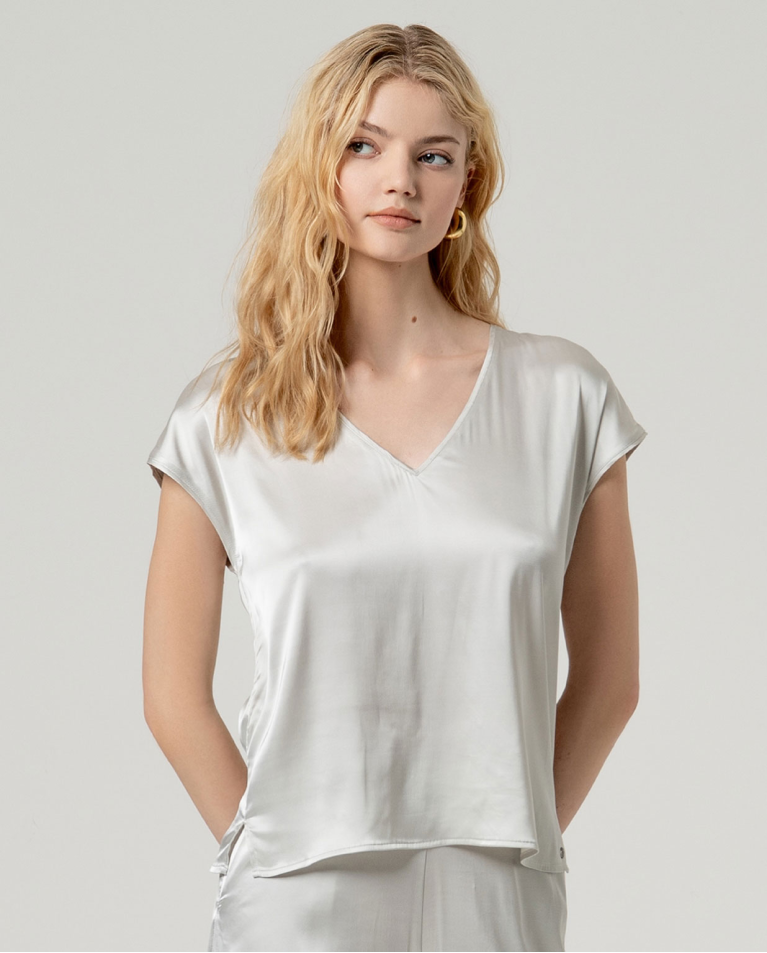 Blusa bege de decote em bico e mangas curtas.