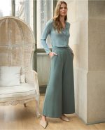 Calças azul céu, largas em modal espesso, um tecido macio, elástico e confortável que favorece os movimentos.