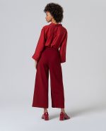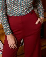 Calças vermelho inglês, corte ligeiramente largo, sem fechos e com dois botões decorativos nos lados da cintura.