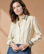Camisa bege de manga 3/4 com gola clássica e botões.