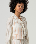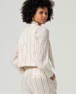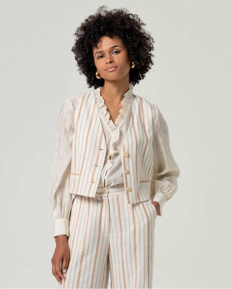 Colete crú com riscas em tons tijolo, decote em V, mangas cava e bolsos frontais.