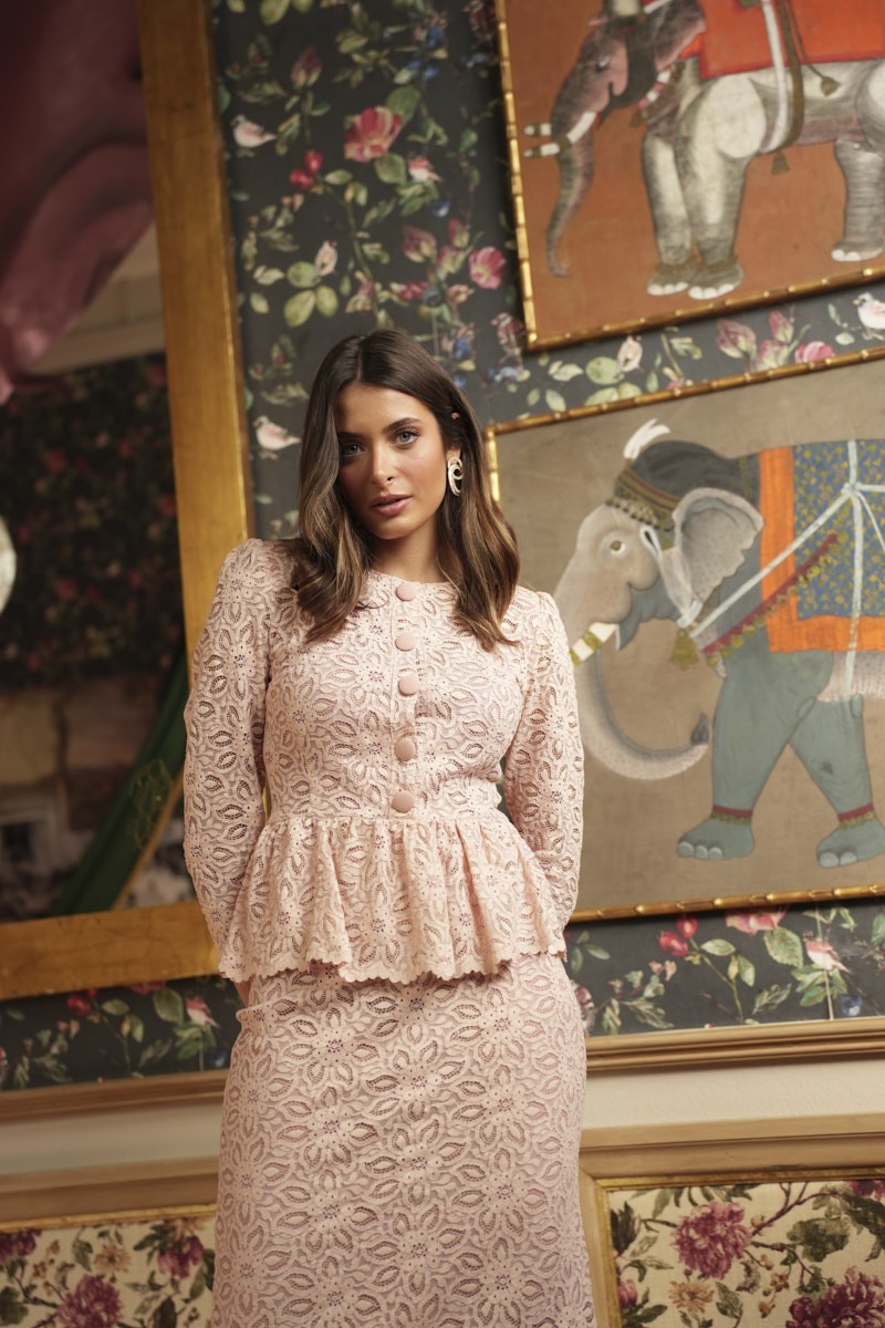 conjunto Alanis é confeccionado em tecido macramê , adicionando textura e elegância ao design.