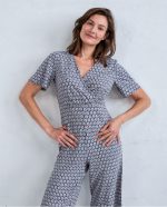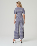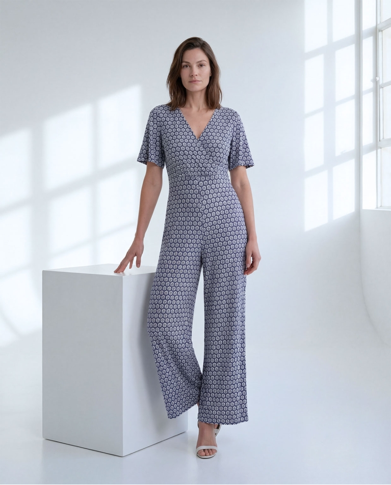 Macacão estampado em tons de azul com decote cruzado e mangas curtas.