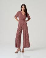 Macacão estampado em tons tijolo com decote cruzado e mangas curtas.