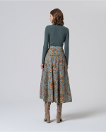 Saia comprida, estampado com ramagens em tons camel e verde.