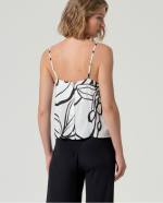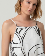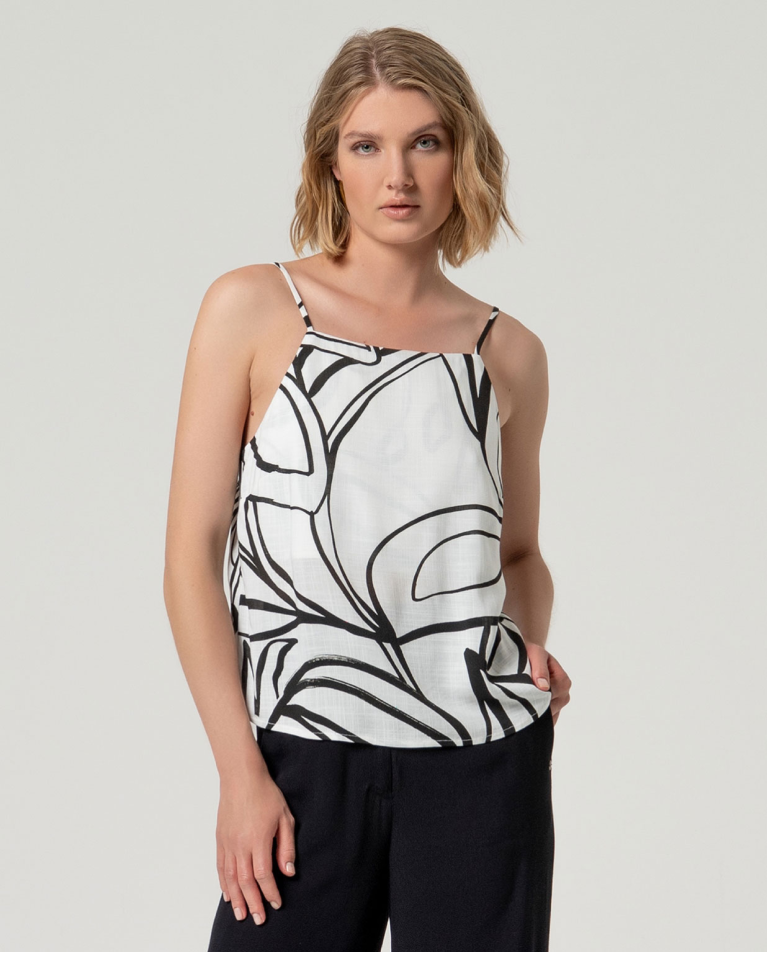 Top branco e preto com alças finas, decote reto e estampado gráfico.