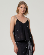 Top preto de alças finas, decote em V e corte direito.
