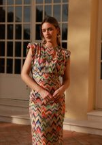 Vestido para convidada, confecionado num tecido estampado com vários tons.