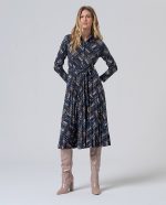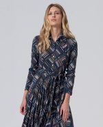 Vestido camiseiro com cinto em tons azuis e bege.