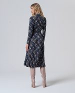 Saia plissada, colarinho e corte evasé.