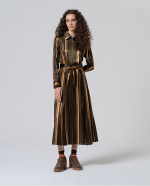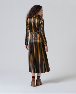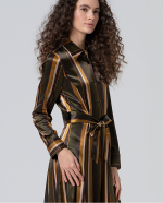 Vestido acetinado, comprido, tipo camiseiro, com riscas ao alto em tons terra.