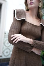 Vestido em malha vazada com decote quadrado e lapelas com franjas.