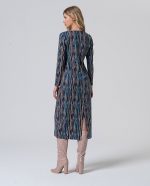 Vestido comprido, corte direito, decote em bico e racha atrás.