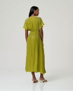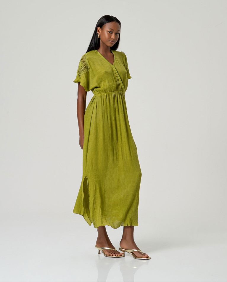 Vestido comprido simples com decote cruzado e mangas curtas largas.