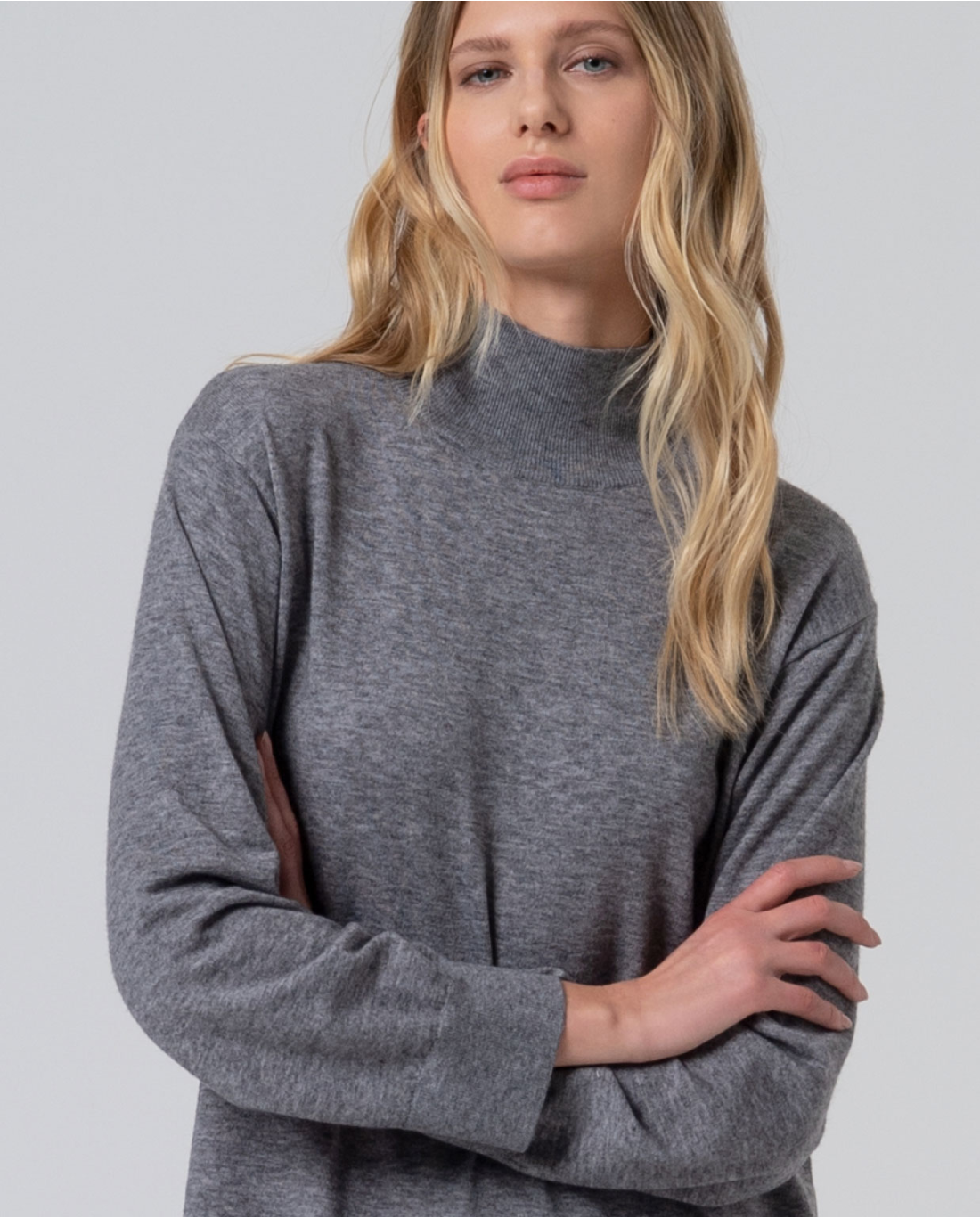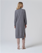 Vestido midi de malha cinzento, corte direito, gola alta e rachas de lado.