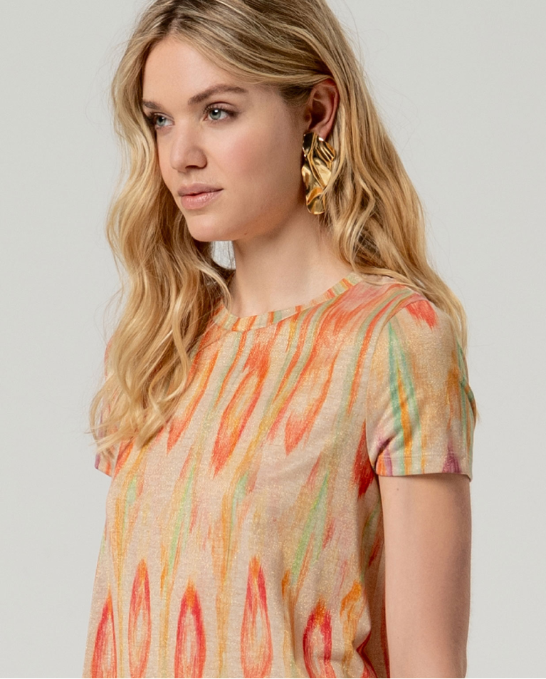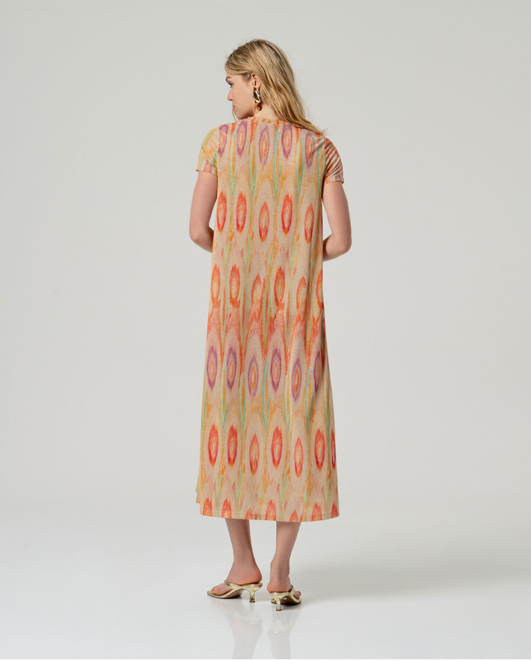 Vestido midi, estampado, com mangas curtas e decote arredondado.